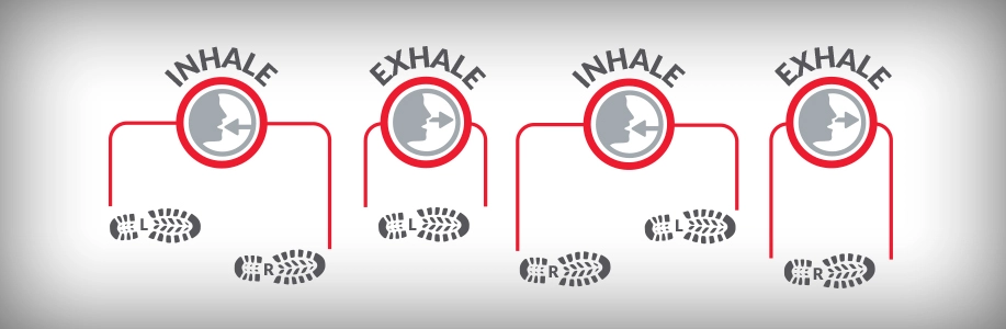 Second, when we inhale, we contract and stabilize our diaphragm and core muscles making them more stable during the inhalation phase of breathing. When your foot hits the ground, the force of impact equals two to three times your body weight. That stress of impact is greatest when your foot strikes the ground. If that impact is at the beginning of an exhalation, it catches us at the most unstable times for the pelvis and core. Rhythmic breathing can train us to time the impact force more with our inhalation (more stability in our diaphragm and core muscles) and to shift the impact from the right foot to the left. And instead of repeatedly inhaling and exhaling on the same foot, a 5-step running pattern can help spread that impact between the feet and reduce the stress on the body. This technique may allow you to maximize your performance and reduce injuries and even side stitches.
